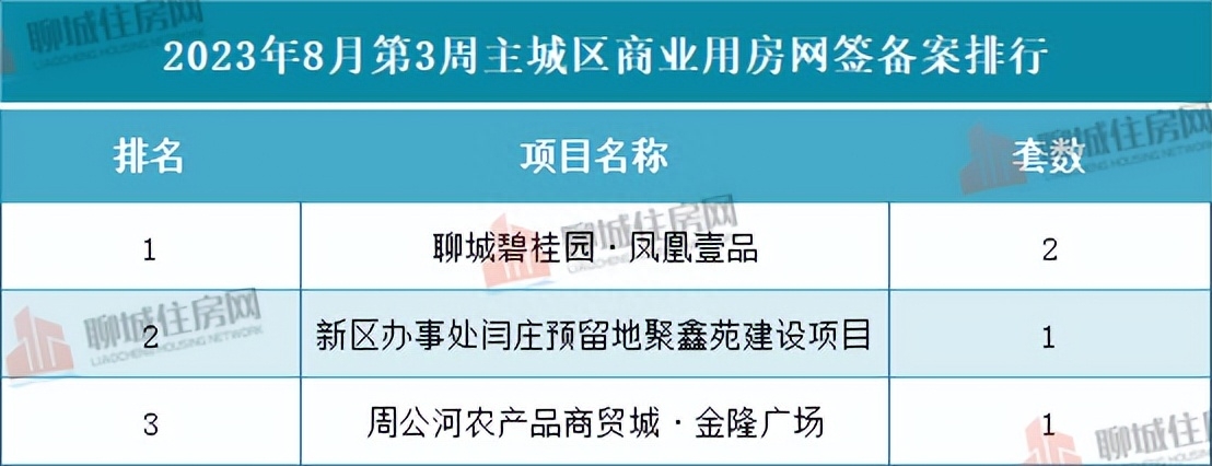 商业用房方面,共有3个项目进行网签备案。数量最多的为聊城碧桂园·凤凰壹品,为2套;其次为新区办事处闫庄预留地聚鑫苑建设项目周公河农产品商贸城·金隆广场并列第二,网签备案套数为1套;