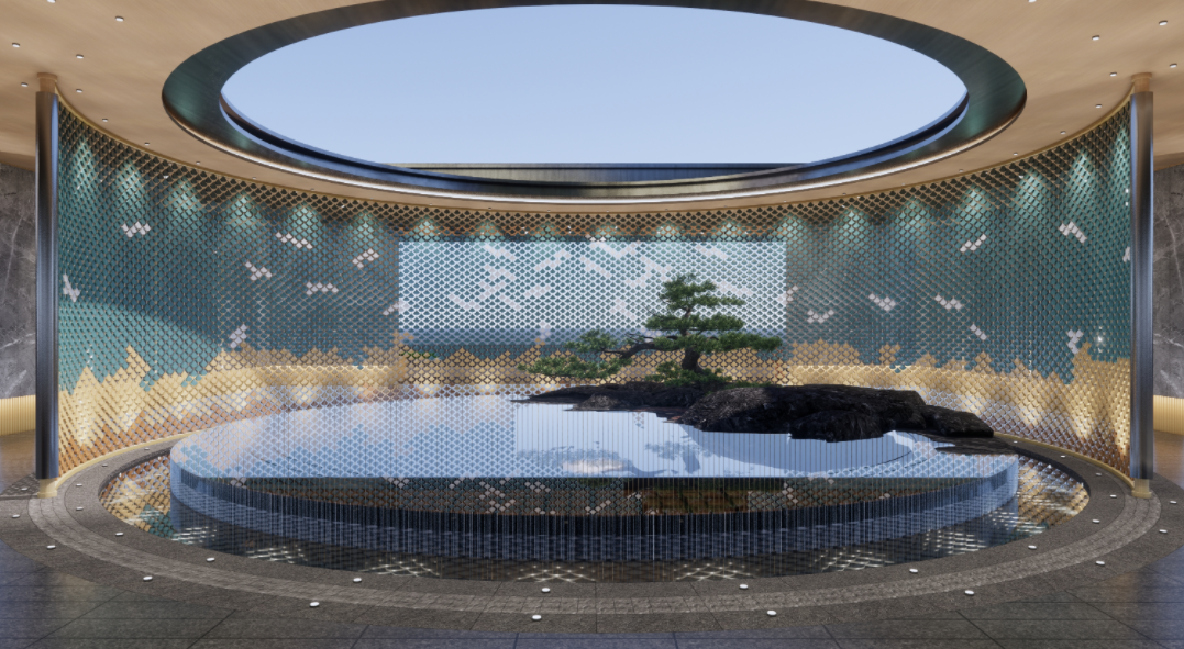 三进礼序入院,取自李唐《万壑松风图》意境的下沉庭院,采用了叠水瀑布,松树、石头、连桥、廊亭、瀑布的层叠布局,把画放进园林,走进园林就有了游园如画的意境。