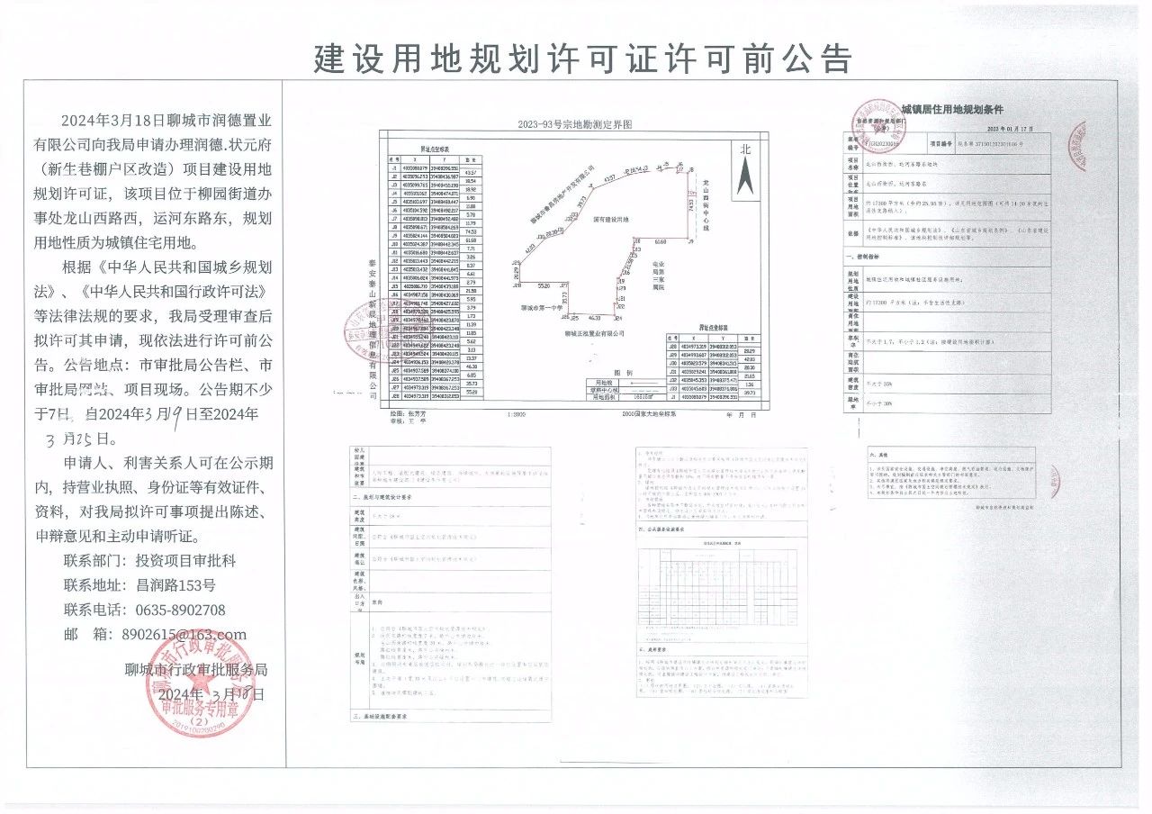 2024年3月18日聊城市润德置业有限公司向我局申请办理润德.状元府(新生巷棚户区改造)项目建设用地规划许可证,该项目位于柳园街道办事处龙山西路西,运河东路东,规划用地性质为城镇住宅用地。 根据《中华人民共和国城乡规划法》、《中华人民共和国行政许可法》等法律法规的要求,我局受理审查后拟许可其申请,现依法进行许可前公告。公告地点:市审批局公告栏、市审批局网站、项目现场。公告期不少于7日,自2024年3月19日至2024年3月25日。 申请人、利害关系人可在公示期内,持营业执照、身份证等有效证件资料,对我局拟许可事项提出陈述、申辩意见和主动申请听证。 联系部门:投资项目审批科 联系地址:昌润路153号 联系电话:0635-8902708 邮箱:8902615@163.com 聊城市行政审批服务局 2024年3月18日