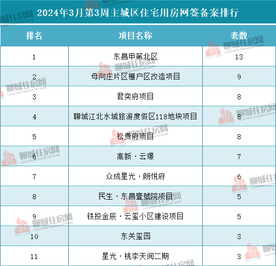 从网签备案项目来看,本周备案项目共计32个。网签备案数量最多的为聊城碧桂园·凤凰壹品,共60套,其次为东昌甲第北区第二,共26套,东关国际西区第三,共25套。