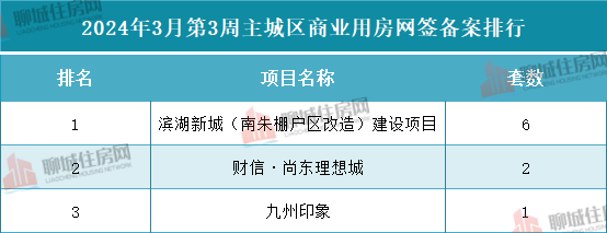 据住房网不完全统计,2024年3月第3周(2024.3.18-2024.3.24)聊城市主城区商品房网签备案数据共计302套!其中,住宅用房共96套,商业用房9套,办公7套,其他(车位、储藏室等其它房屋)为190套。