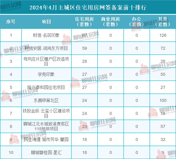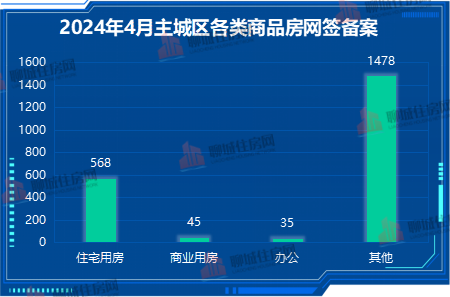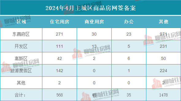 房屋类型网签数据来看,4月份的网签量其他用房位列第一,共1478套,其中东昌府区网签971套,开发区网签231套,高新区网签50套,旅游度假区网签224套,其他用房2套;住宅用房位居第二,共568套,其中东昌府区网签271套,开发区网签111套,高新区网签42套,旅游度假区网签142套,其他地区2套第三名为商业用房,共计45套其中东昌府区网签30套,开发区网签13套,高新区网签2套第四名为办公用房,共35套,其中东昌府区网签23套,开发区网签5套,高新区网签6套,旅游度假区1套