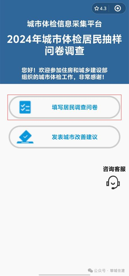 点击【填写居民调查问卷】☞选择您所在的省份、城市、区、街道、社区。