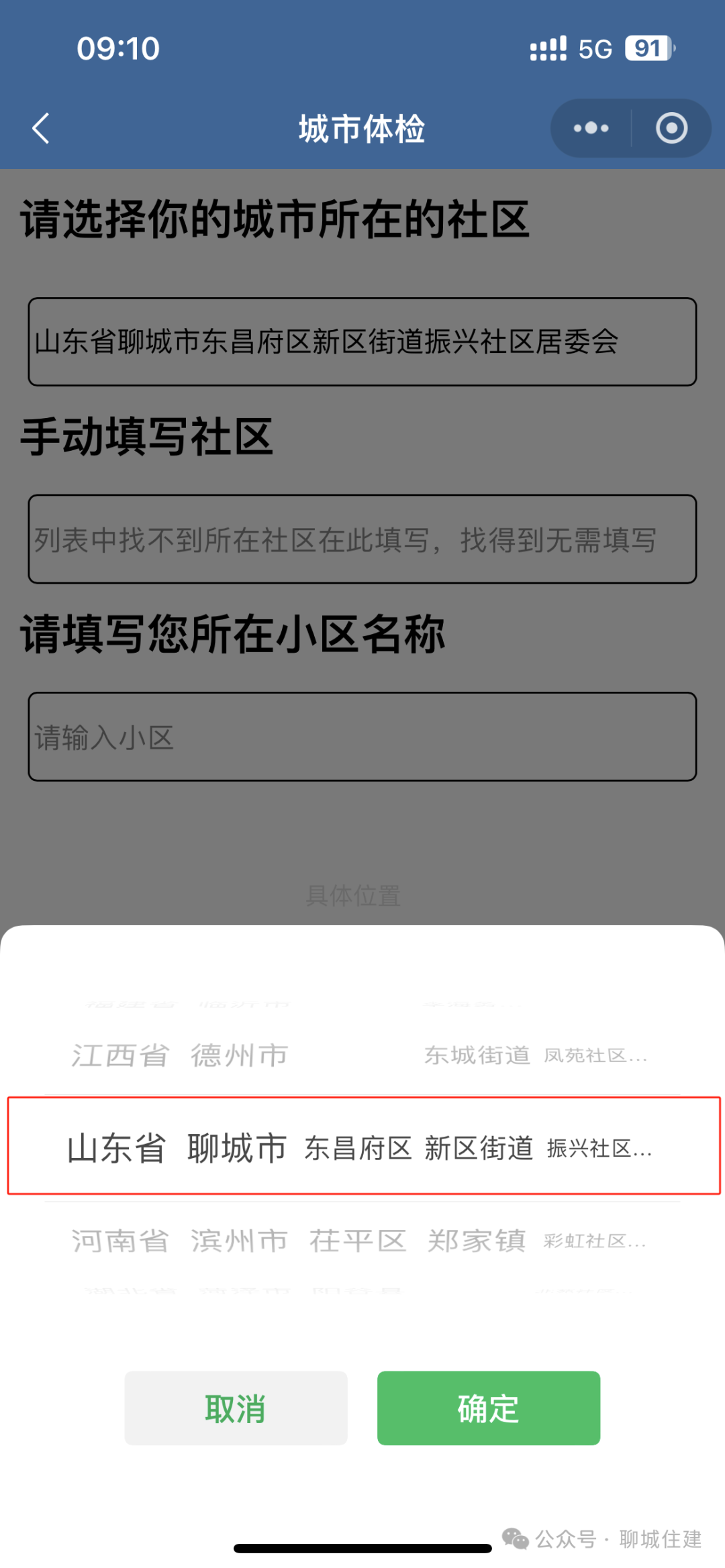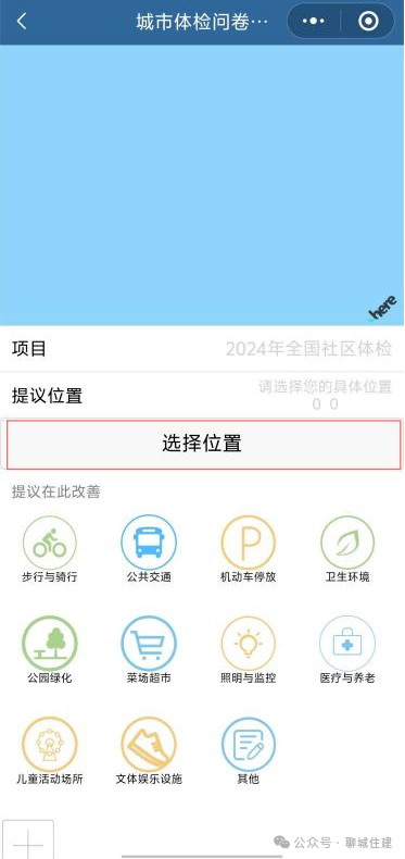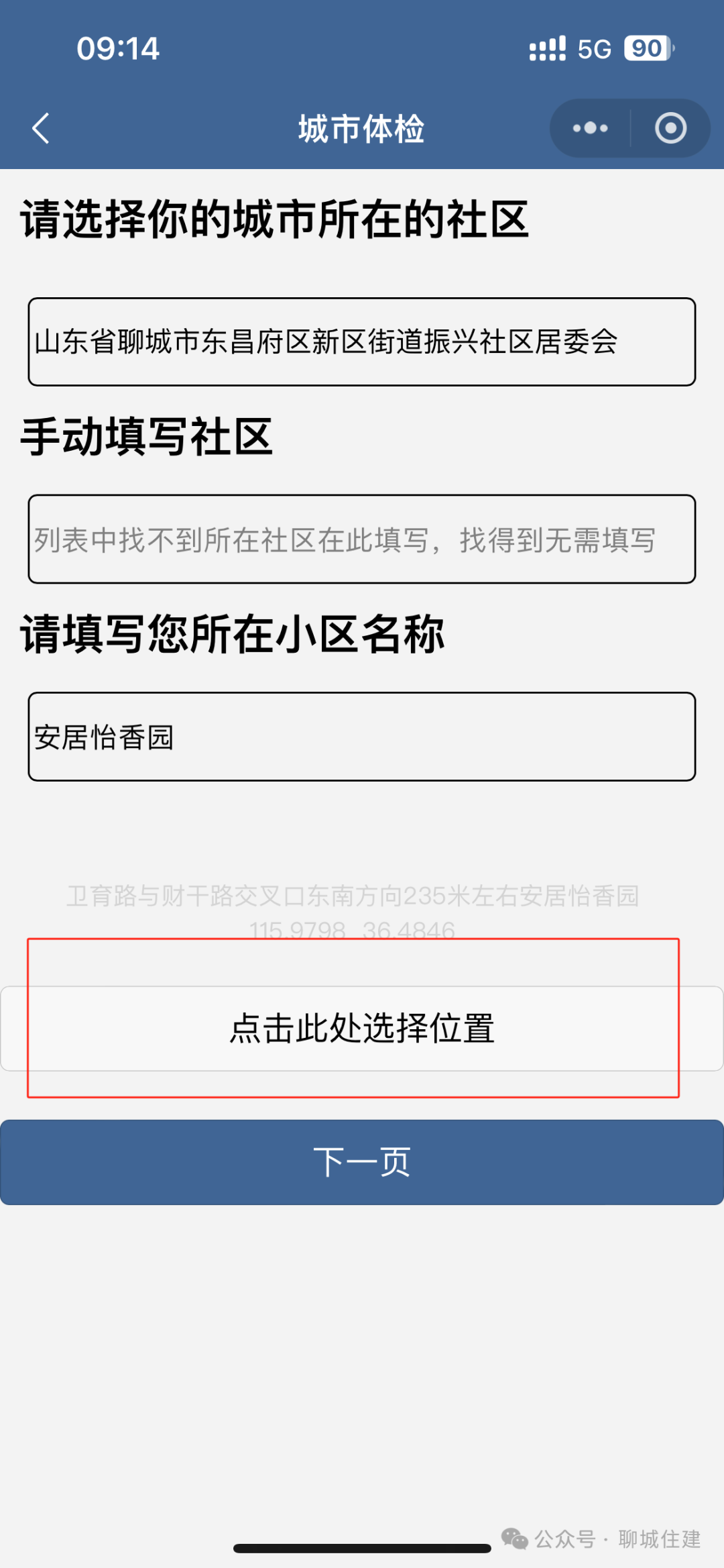 填写您所在小区名称,☞【此处选择位置】,选择或者搜索您所在的小区,完成后☞【下一页】填写问卷并提交。