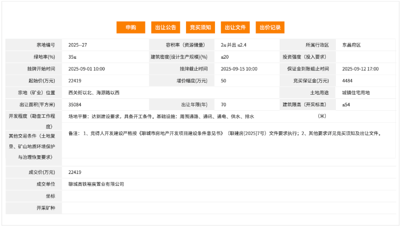 今日,聊城城区前期出让的一宗城镇住宅用地在官方网站进行集中竞拍,以底价成交