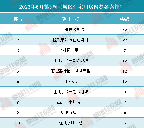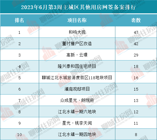 在住宅用房方面,网签备案项目共38个。数量最多的为董付棚户区改造,共42套;其次为隆兴泰和园住宅项目,网签备案套数为22套;碧桂园·星汇网签备案21套均位列第三。