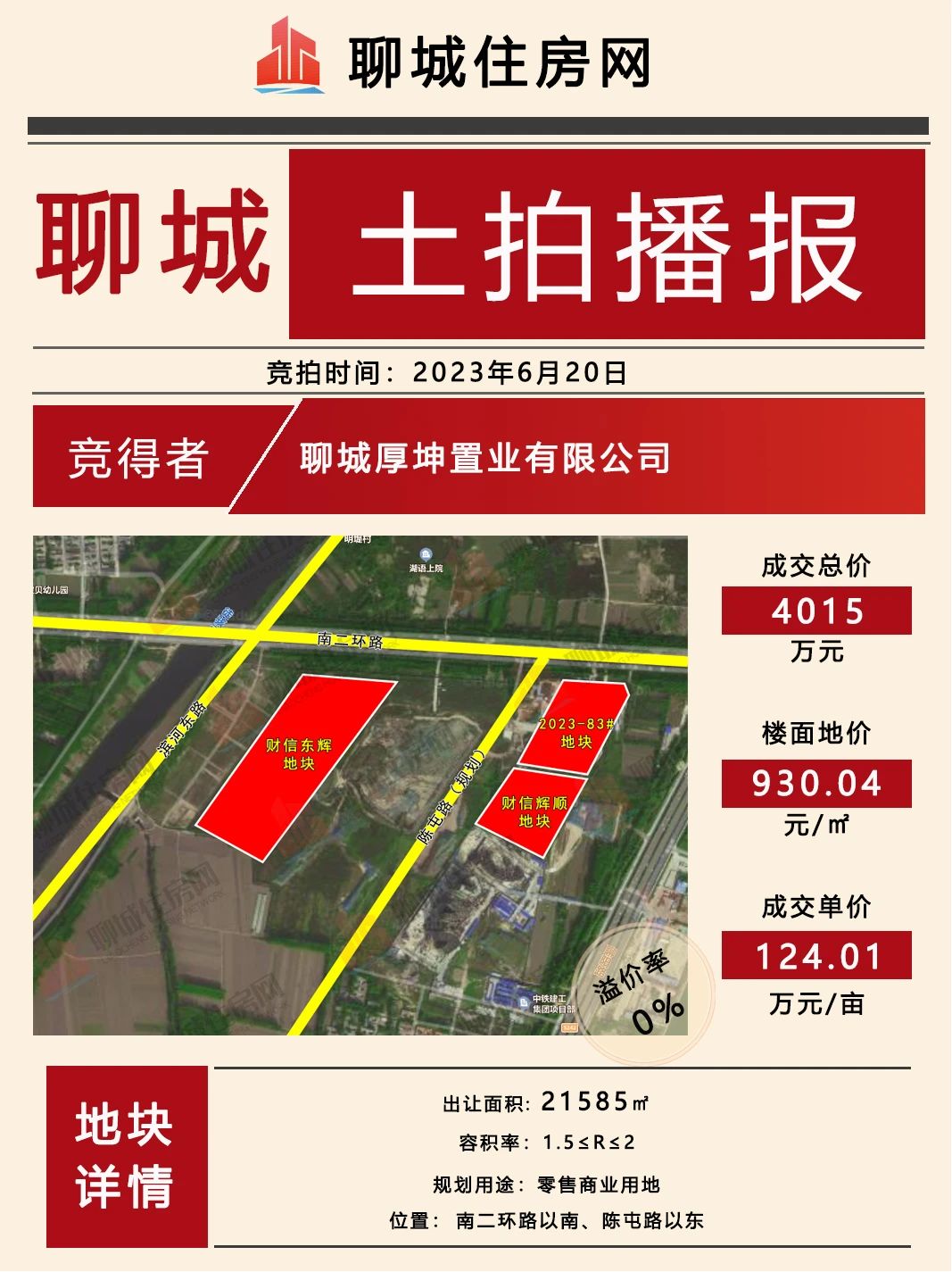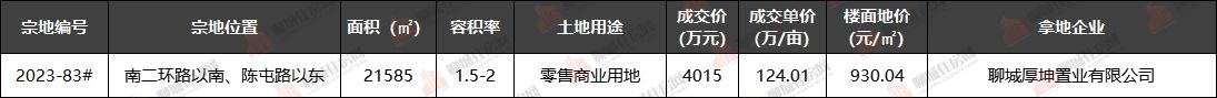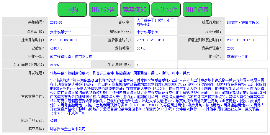 6月20日,聊城城区前期出让的1宗零售商业用地在官方网站进行集中竞拍,聊城厚坤置业有限公司以底价4015万元摘得。