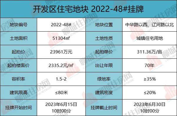 该地块位于中华路以西、辽河路以北,占地面积为51304㎡,容积率1.5≤R≤2,起拍价23961万元,起拍单价约合311.36万/亩,起拍楼面价约合2335.2元/㎡,建筑密度≤20%,建筑限高≤80m,绿地率≥35%。