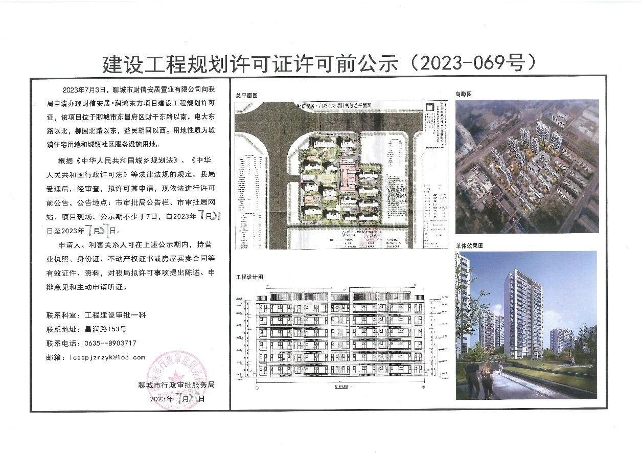 2023年7月3日,聊城市财信安居置业有限公司向我局申请办理财信安居·润鸿东方项目建设工程规划许可证,该项目位于聊城市东昌府区财干东路以南,电大东路以北,柳园北路以东,益民胡同以西。用地性质为城镇住宅用地和城镇社区服务设施用地。