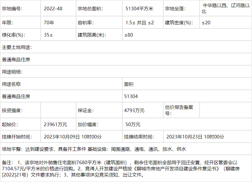 六、本次国有土地使用权挂牌活动 在 聊城市公共资源交易中心网站(http://ggzyjy.liaocheng.gov.cn)“电子交易系统-新”土地交易入口 进行。该地块挂牌时间为:2022-48 号地块:2023年10月09日 10时00分 至 2023年10月23日 10时00分;