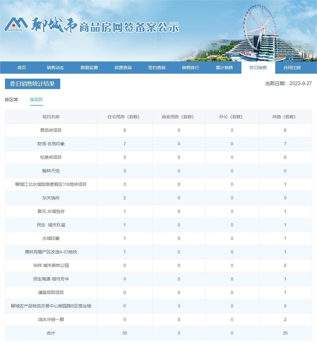 2023年9月26日,聊城市主城区商品房网签统计共59套。其中住宅用房30套,商业用房3套,其他26套。