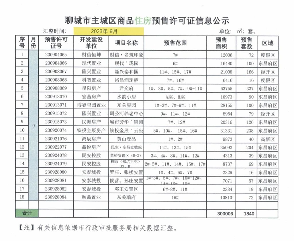 聊城主城区9月共办理商品住房预售许可证18件,套数为1840套
