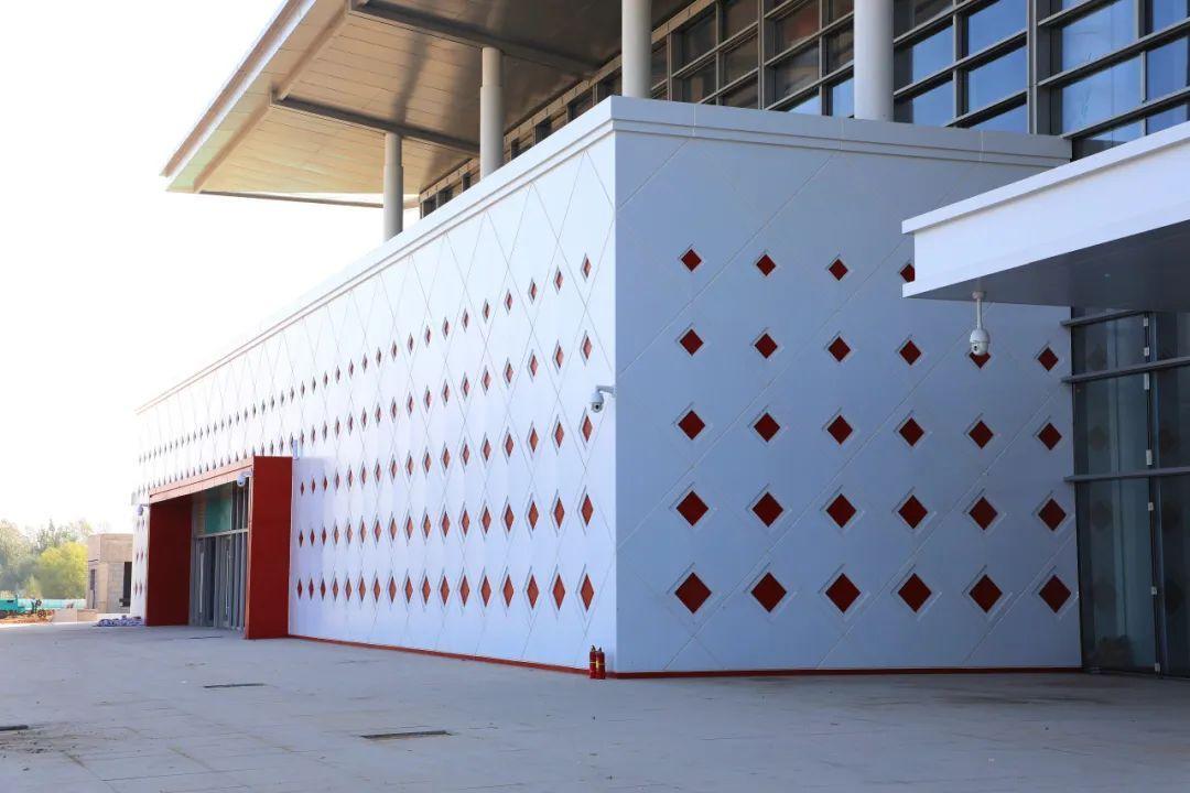 站房设计以“铝城枣乡”为主题,建筑外幕墙选用铝板为建筑材料,彰显铝精深加工产业作为茌平现代化产业的重要地位;同时将圆铃大枣的红色进行抽象提炼,结合剪纸图案运用到建筑外幕墙的图案设计中。